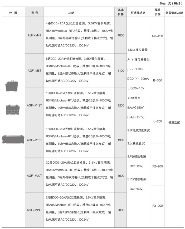 AGF-T穿孔式光伏匯流采集裝置是專門應用于智能光伏匯流箱,用于監測光電池陣列中電池板運行狀態,組串電流測量,匯流箱中防雷器狀態采集、直流斷路器狀態采集、裝置帶有RS485接口可以把測量和采集到的數據和設備狀態上傳。
