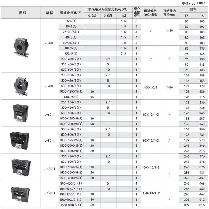 規格 額定電流比(A) 準確級 穿心匝數 母排規格/根數