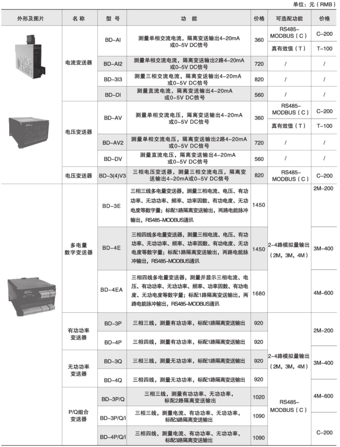 | 有功功率變送器 | BD-3P | 三相三線,測(cè)量有功功率,隔離變送輸出模擬信號(hào) | 2-4路模擬量輸出 RS485-MODBUS |